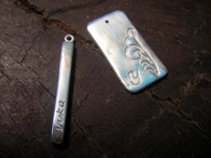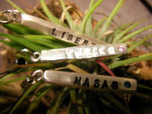 | ーYちゃんのコメントー 初めてということもあり、なるべくシンプルで 簡単なものを作ろうと思いプレート形と棒形の 至ってシンプルなデザインにしたのですが 「あっさり終わると思います」とか言いつつ 一番最後までかかってしましました。 次回はリングやピアスにもチャレンジしたいと思います。 すっごく楽しかったです。 ありがとうございました。 |