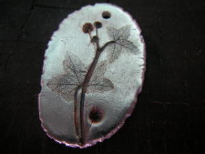 ![]() この課題では板状に伸ばす技術と 葉っぱを転写し磨く技術 そしていぶして色をつける方法を学びます。 |