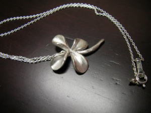 | Tくんは日頃の感謝の気持ちを込めて この4葉のクローバーペンダントを 母の日の為に作られました。 今後2年間は帰国出来ず会えないからと 難しい作品でしたが、がんばったおかげで 世界に1つのクローバーを完成させました。 |
