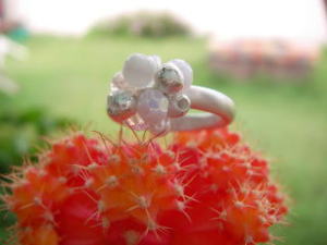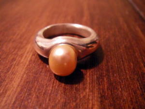 | Nちゃんは淡水パールを使ったリングを 作りました。写真は黄みがかっていますが 実際はかわいいピンクのパールでNちゃんの 細い指にぴったりの素敵なリングが完成しました。 |