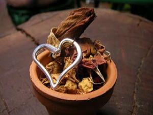 | Aさんは今回2つのペンダントを 作っていかれました。 銀粘土を一本のひも状に伸ばし ラインを作っていきます。 ハートに巻き付けられた部分が オリジナルでとても素敵ですね。 |