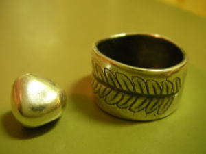 | -Tさんのコメント- 今回初の銀アクセサリー作りに挑戦してみました。 生徒さんが作っているのを横目で見ていると 自分で作ってみたい虫がムズムズ。 とりあえずジンプルなリングをと思い ベーシックな物を作ってみました。 そして余った銀粘土で彼女へのネックレスヘッドを.. 水分の加減と表面をスムーズにする所が 難しかったけど楽しかった。 このアウトドアな作業場と道具、小物に囲まれた空間が 好きでした。 また作ってみたいです。 ありがとうございました。 |