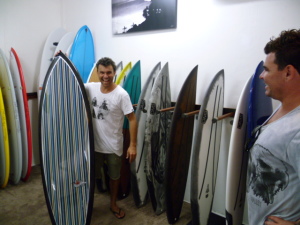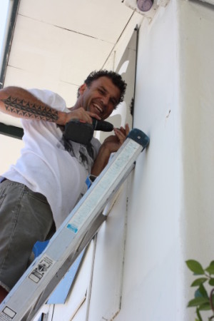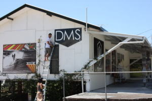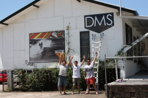 | DMSサーフボードのダンとマイケルがでっかいロゴサインを取付けに来てくれました。「ドリルの刃がねぇぞ」とか「ネジが足りねーぞ」なんて感じだったけど2人とも汗だくでヤイヤイ言いながら楽しそうに作業してくれました。 でも最後は職人魂でビシッ!と決めてくれたのはやっぱさすがだねDan。 「アリガットゴザーマス!」です。 |