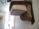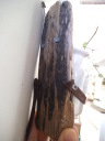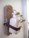2.そこにコップやビンなどをひと巻き回せる長さの革ひもを用意します。私は使わなくなった革のバッグを切って使いましたので広めの幅が取れました。